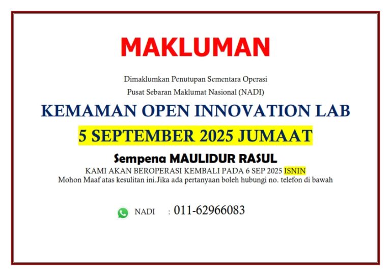 MAKLUMAN PENUTUPAN SEMENTARA NADI KEMAMAN OPEN INNOVATION LAB PADA 15 &16 SEPTEMBER 2025 SEMPENA CUTI KHAS OLEH PERDANA MENTERI DAN HARI MALAYSIA. NADI AKAN BEROPERASI SEMULA PADA 17 SEPTEMBER 2025 RABU.